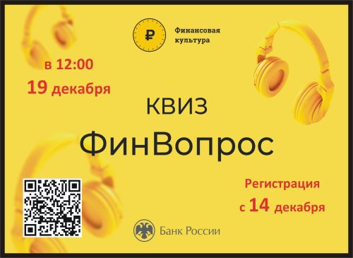 Онлайн-викторина «ФинВопрос» стартует 19 декабря в 12:00 по московскому времени. Включиться в игру, проверить свои знания и стать победителем может любой желающий. К участию приглашается молодежь: студенты и учащиеся высших и средних учебных заведений, курcанты и военнослужащие.