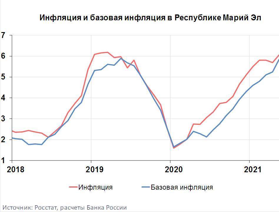 В мае 2021 года годовая инфляция в Республике Марий Эл ускорилась на 0,41 п.п. и составила 6,06%. Она оставалась ниже показателя по Приволжскому федеральному округу (6,30%), но по-прежнему превышала среднероссийское значение (6,02%). Рост стоимости продовольственных и непродовольственных товаров ускорился на фоне постепенного переноса возросших издержек в розничные цены. Годовой прирост стоимости услуг уменьшился под влиянием эффекта высокой базы.