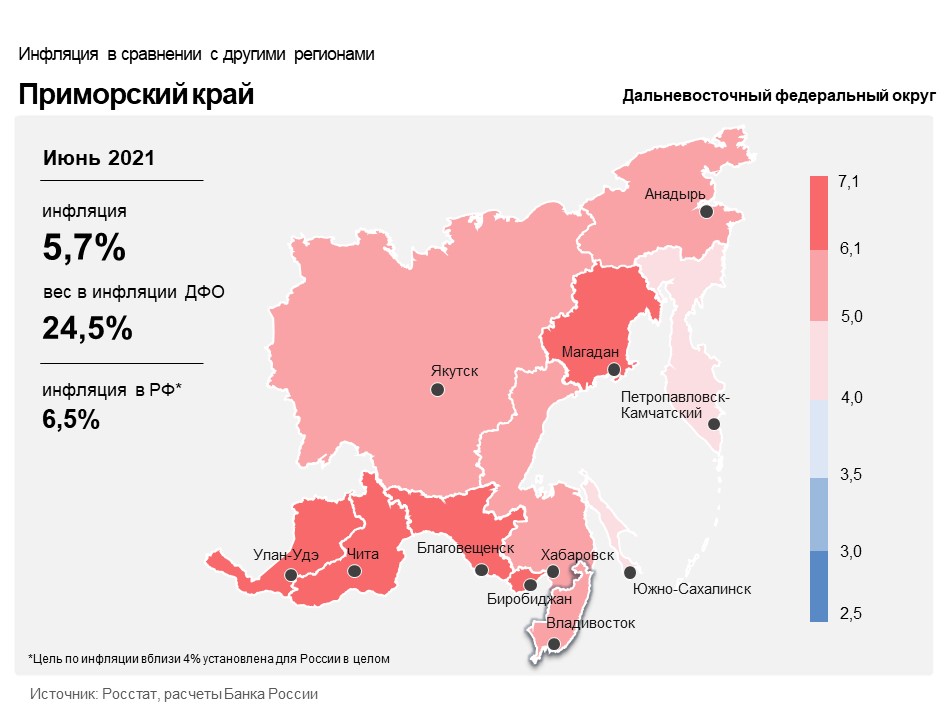 Годовая инфляция в Приморье в июне 2021 года увеличилась до 5,65% после 5,43% в мае, превысив значение по Дальневосточному федеральному округу — 5,60%, но осталась ниже, чем в целом по России, — 6,50%. На динамику цен в крае по-прежнему оказывал влияние общероссийский проинфляционный фактор — продолжающийся рост спроса наряду с сохраняющимся давлением со стороны издержек.