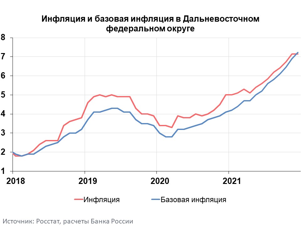 Годовая инфляция в Дальневосточном федеральном округе (ДФО) в декабре 2021 года почти не изменилась и составила 7,15% после 7,14% в ноябре. При этом она осталась ниже, чем в целом по России, — 8,39%. Динамика цен на товары и услуги в округе сформировалась под влиянием разнонаправленных факторов. Проинфляционное влияние оказали общероссийские факторы: рост издержек производителей и поставщиков, а также сохраняющееся отставание динамики предложения от расширения спроса на отдельные непродовольственные товары. Дезинфляционное влияние оказали региональные факторы: ослабление спроса на некоторые услуги и расширение предложения на отдельных продовольственных рынках. Дополнительное сдерживающее влияние оказал эффект высокой сравнительной базы 2020 года в динамике цен на некоторые продукты питания.