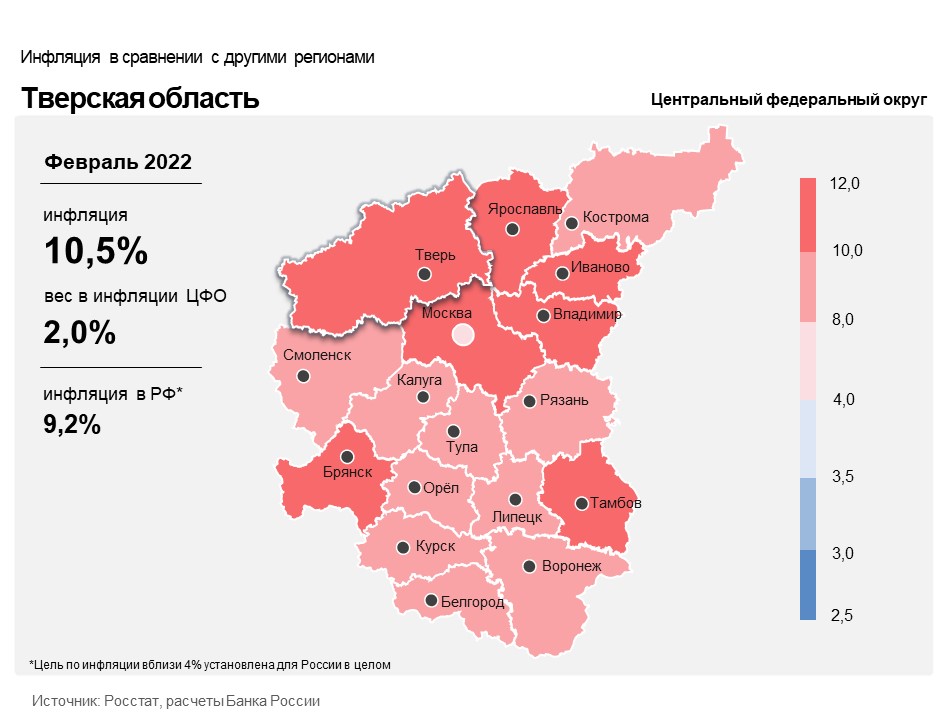 Годовая инфляция в Тверской области в феврале 2022 г. ускорилась до 10,51% после 9,76% в январе. При этом ее значение было выше, чем в Центральном федеральном округе и России в целом (9,26% и 9,15% соответственно), где также наблюдалось ускорение инфляции.