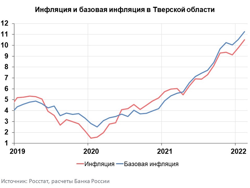 Базовая инфляция в Тверской области ускорилась с 10,53% в январе до 11,26% в феврале 2022 г., превысив общий индекс потребительских цен в регионе (10,51%).