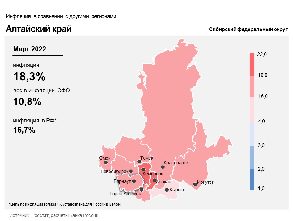 Годовая инфляция в Сибирском федеральном округе в марте возросла до 18,26% после 10,16% в феврале, что выше показателя по России в целом. На ускорение инфляции в округе, как и в России в целом, преимущественно повлияли последствия введенных внешних санкций — ослабление рубля, всплеск спроса из-за повышения инфляционных ожиданий, ограничение поставок из-за рубежа, рост издержек производителей и поставщиков.