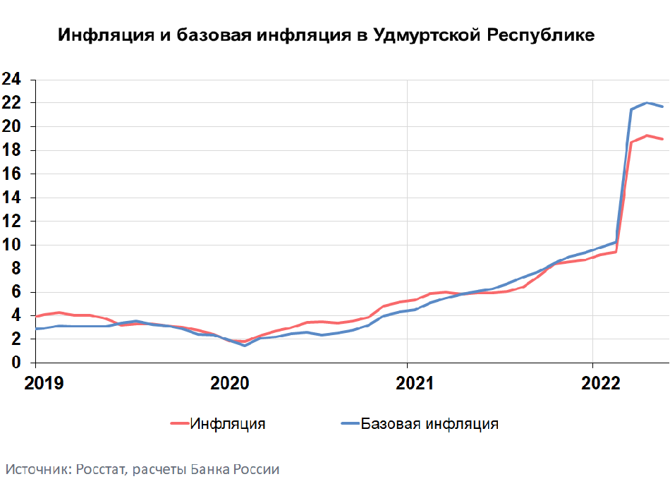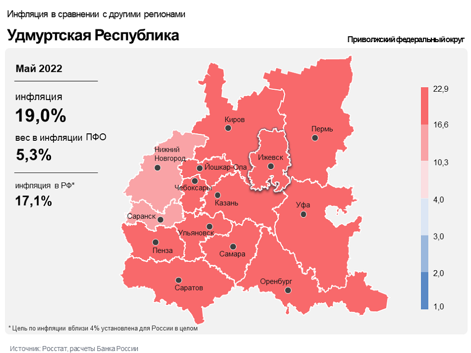 В мае 2022 года годовая инфляция в Удмуртской Республике замедлилась до 18,99% после 19,26% в апреле. Это выше показателя по Приволжскому федеральному округу (17,86%) и в целом по России (17,10%). На динамику инфляции в регионе в основном оказали влияние общероссийские факторы: исчерпание эффектов ажиотажного спроса со стороны населения и укрепление рубля.