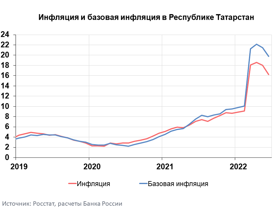 Годовая инфляция в Республике Татарстан в июне 2022 года замедлилась до 16,20% после 18,01% в мае. Это ниже, чем в Приволжском федеральном округе (16,49%) и выше, чем в России в целом (15,90%). На динамику цен в республике преимущественно повлияли продолжавшееся укрепление рубля и увеличение предложения ряда товаров.