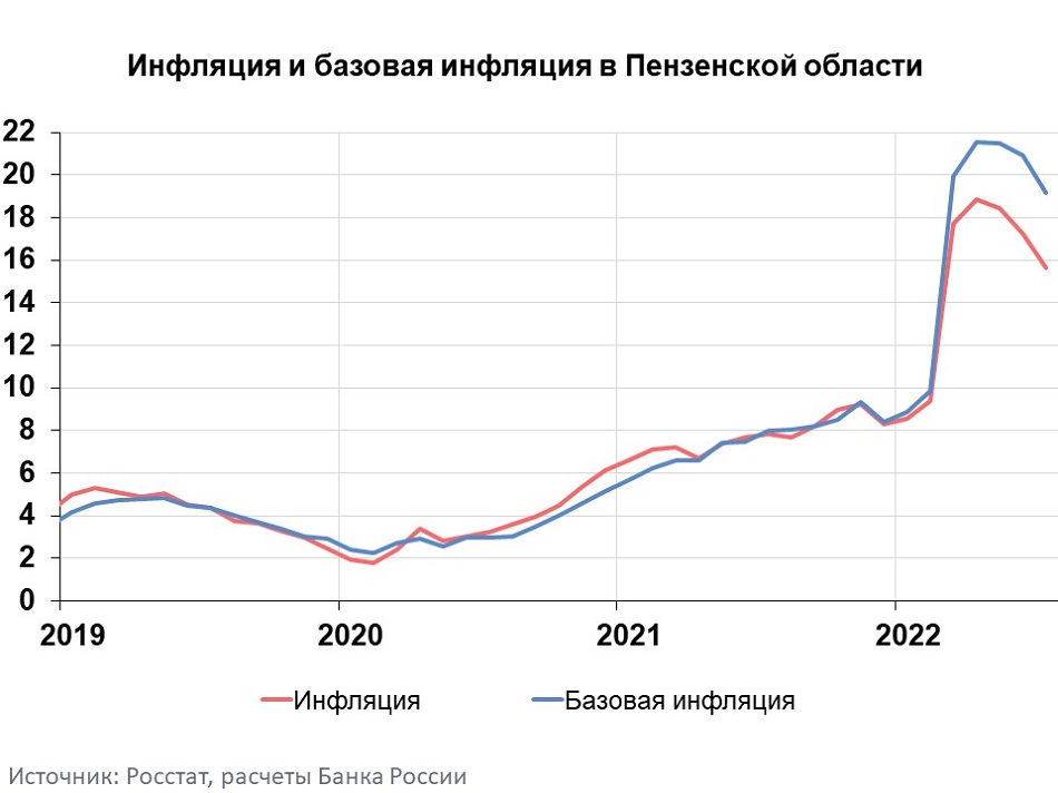 Годовая инфляция в Пензенской области в июле 2022 года замедлилась по сравнению с июнем на 1,59 п.п., до 15,66%. Это по-прежнему выше, чем в Приволжском федеральном округе (15,54%) и в целом по России (15,10%). На ценовую динамику в регионе в основном повлияли укрепление рубля в предыдущие месяцы, расширение предложения отдельных товаров, ослабление потребительского спроса после мартовского всплеска и смягчение денежно-кредитных условий. Сказалась и высокая сравнительная база прошлого года.