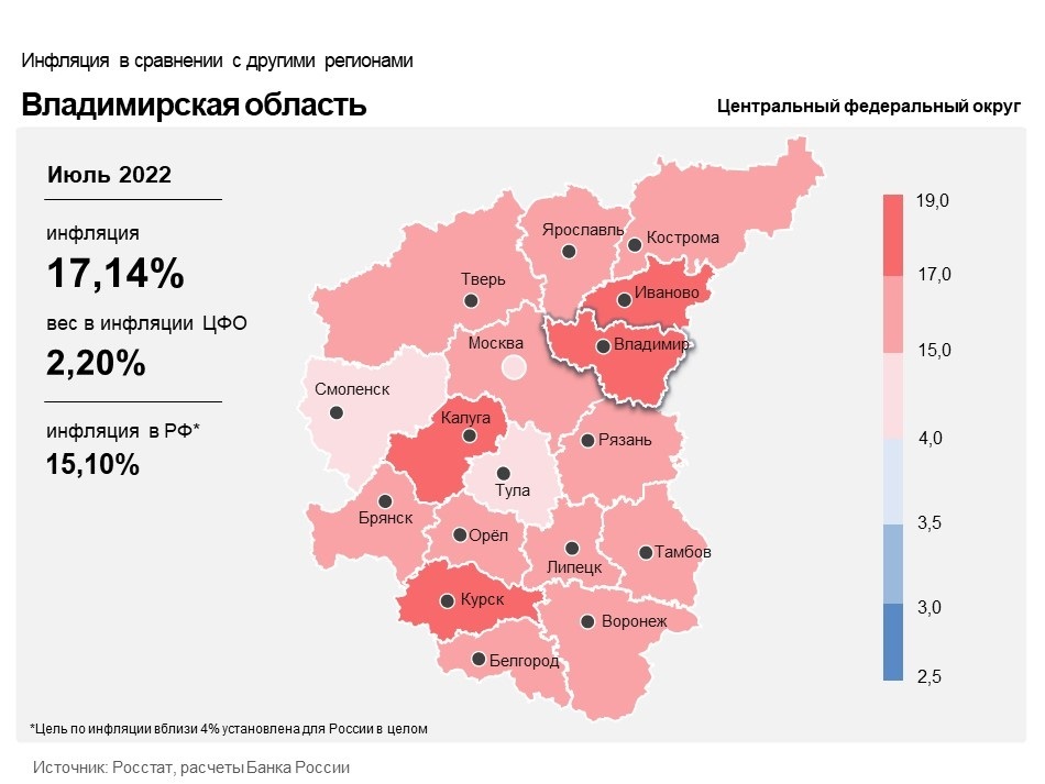 В июле 2022 года во Владимирской области годовая инфляция снизилась до 17,14% с 18,05% в июне, что соответствует общероссийской тенденции. Уровень инфляции в регионе сложился выше, чем в Центральном федеральном округе и России (15,52% и 15,10% соответственно). Динамика цен была обусловлена увеличением предложения на отдельных товарных рынках, сокращением издержек производителей ряда продовольственных товаров, снижением спроса на отдельные непродовольственные товары после его всплеска в начале весны и укреплением рубля.