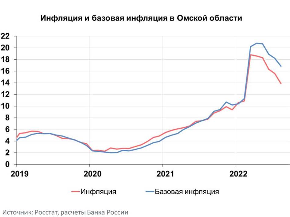 Годовая инфляция в Омской области в августе 2022 года замедлилась на 1,7 п.п., до 13,86%. Она сложилась ниже значений и по России (14,30%), и по Сибирскому федеральному округу (14,76%). Замедлению роста цен в регионе способствовали укрепление рубля, расширение предложения на отдельных товарных рынках, а также продолжающееся после весеннего всплеска снижение спроса на некоторые продовольственные и непродовольственные товары. На замедление годового роста цен на услуги во многом повлияли временные факторы в сфере авиаперевозок.