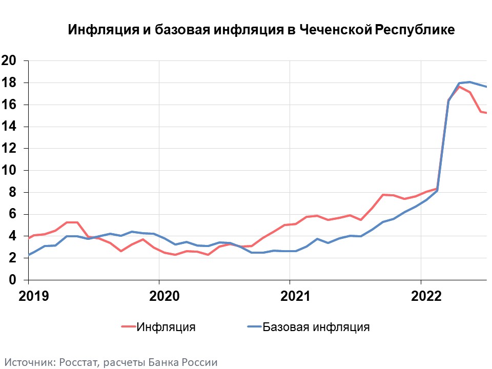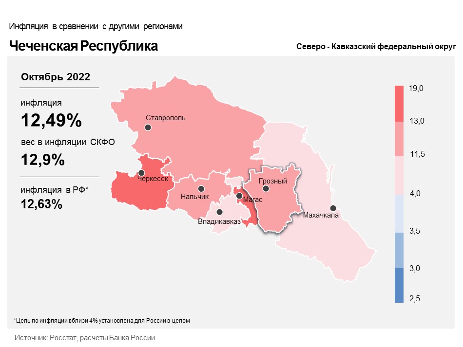 Годовая инфляция в Чеченской Республике в октябре 2022 года замедлилась до 12,49% после 12,84% в сентябре. Это выше, чем в Северо-Кавказском федеральном округе (12,16%) и ниже, чем в целом по России (12,63%). Основными факторами, оказавшими влияние на динамику инфляции в регионе, стали увеличение предложения отдельных продовольственных товаров, а также снижение затрат производителей.