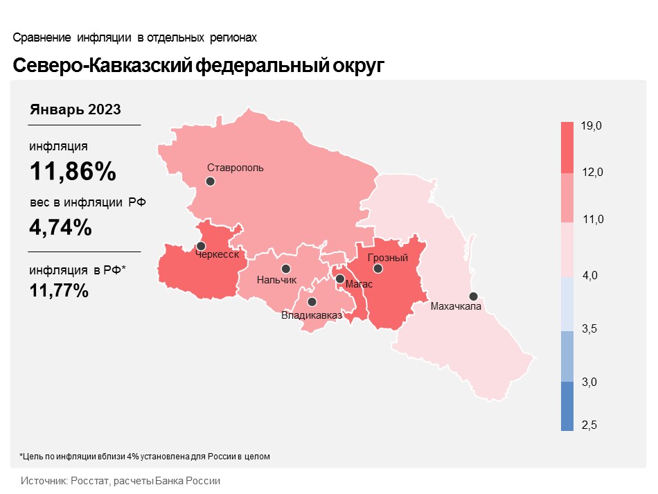 В январе годовая инфляция ускорилась в пяти регионах округа (Республике Дагестан, Чеченской и Карачаево-Черкесской республиках, а также Республике Северная Осетия-Алания и Ставропольском крае), в Республике Ингушетия и Кабардино-Балкарской Республике замедлилась.