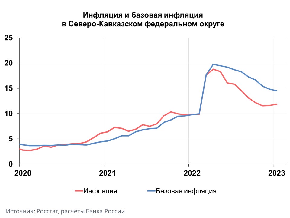 Базовая инфляция в СКФО замедлилась после 14,82% в декабре 2022 года до 14,50% в январе, что выше уровня общей инфляции в округе.