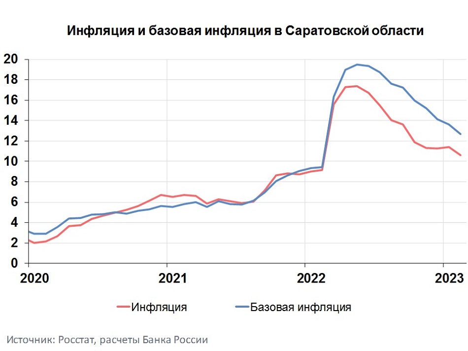 В феврале 2023 года годовая инфляция в Саратовской области замедлилась до 10,59% после 11,42% месяцем ранее. Это ниже, чем в Приволжском федеральном округе (10,90%) и в целом в России (10,99%). На динамику инфляции в регионе в основном повлияли несколько факторов: расширение предложения отдельных товаров, снижение давления со стороны издержек производителей продовольствия и сдержанная потребительская активность.