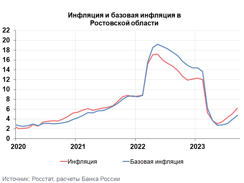 Годовая инфляция в Ростовской области в сентябре 2023 года увеличилась до 6,22% после 5,06% в августе. Это было связано в основном с продолжающимся ростом издержек производителей товаров и услуг, в том числе из‑за ослабления рубля, увеличением спроса на отдельные непродовольственные товары, а также сокращением предложения мясопродуктов в регионе. Годовые темпы прироста цен на Дону были ниже, чем в Южном федеральном округе (6,55%), однако превышали показатель по России в целом (6,00%).