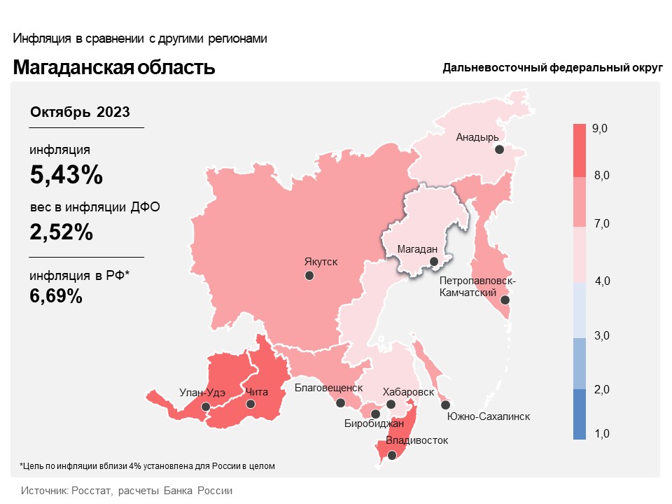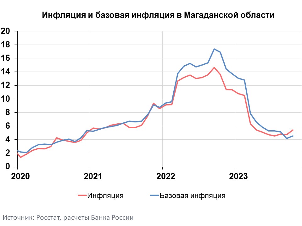 Годовая инфляция в Магаданской области в октябре 2023 года ускорилась до 5,43% после 4,73% в предыдущем месяце. Основные причины — сокращение предложения на отдельных товарных рынках, произошедшее ранее ослабление рубля, а также увеличение издержек производителей и поставщиков услуг. В целом по России годовая инфляция в октябре ускорилась до 6,69% после 6,00% месяцем ранее, по Дальневосточному федеральному округу — до 7,67% после 7,00% в сентябре.