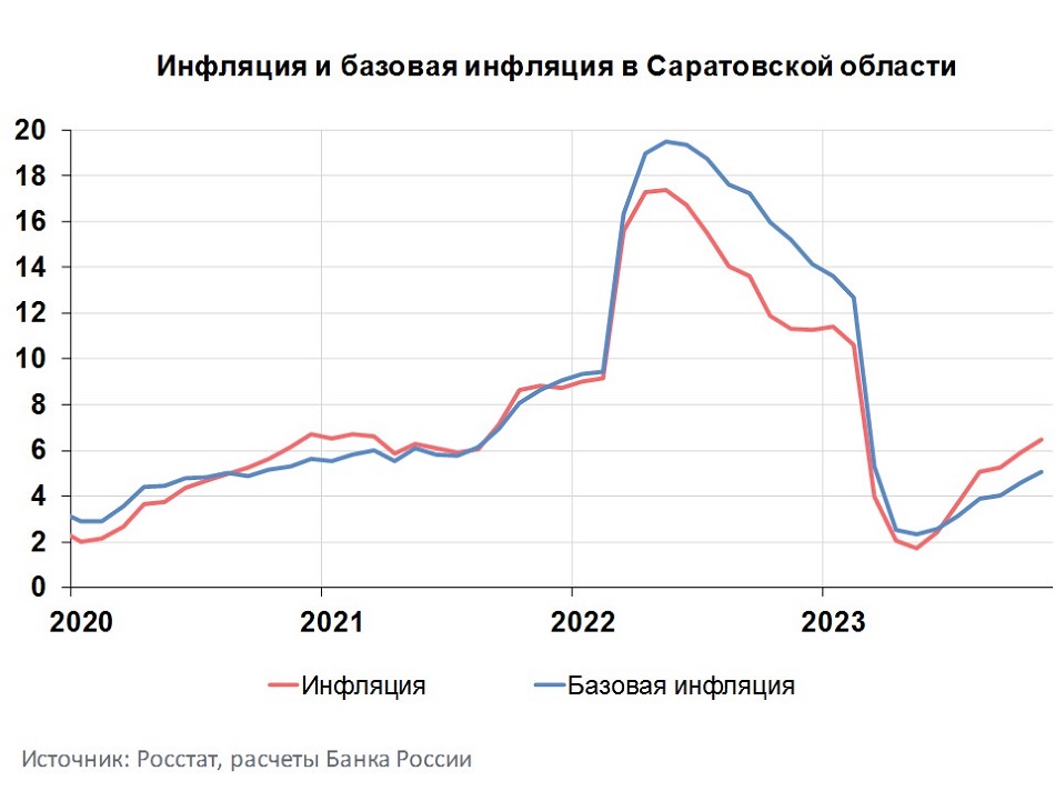 Годовая инфляция в Саратовской области в ноябре 2023 года ускорилась до 6,47% после 5,91% в предыдущем месяце. Во многом это объясняется высокой потребительской активностью и усилением давления со стороны издержек производителей и поставщиков, в том числе из-за произошедшего ранее ослабления рубля и нехватки трудовых ресурсов. При этом инфляция в регионе сложилась ниже, чем в Приволжском федеральном округе (7,19%) и в целом по России (7,48%).