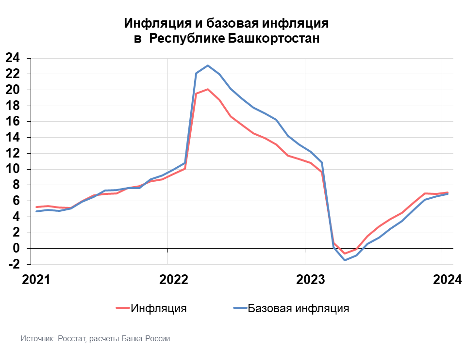 Годовая инфляция в Республике Башкортостан в январе 2024 года ускорилась и составила 7,05% после 6,87% в предыдущем месяце. Инфляция в регионе сложилась ниже уровня по Приволжскому федеральному округу (7,23%) и по стране в целом (7,44%). Спрос на отдельные непродовольственные товары и услуги в республике рос быстрее, чем их предложение. Это позволило производителям и поставщикам активнее переносить возросшие ранее издержки в конечные цены и стало основной причиной роста инфляции.