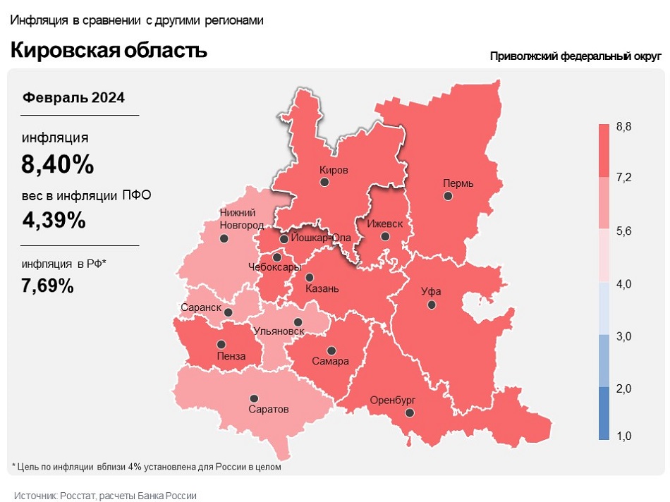 Годовая инфляция в Кировской области в феврале 2024 года ускорилась до 8,40% после 8,17% в январе. Это выше, чем в Приволжском федеральном округе (7,54%) и в целом в России (7,69%). В основном такая динамика цен в регионе была обусловлена тем, что некоторые производители на фоне высокого спроса переносили возросшие ранее издержки в цены. Дополнительным фактором стало изменение некоторых регулируемых тарифов.