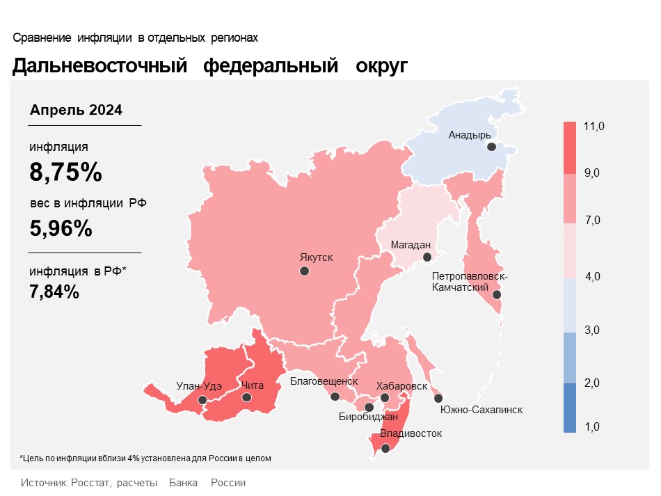 В апреле 2024 года годовая инфляция ускорилась в 5 из 11 регионов ДФО. В Республике Бурятия, Забайкальском крае, Амурской, Магаданской и Сахалинской областях, Чукотском автономном округе она замедлилась.