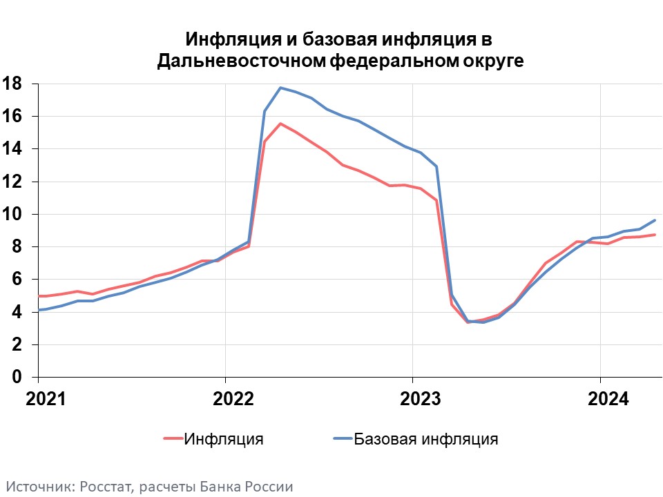 Годовая инфляция в Дальневосточном федеральном округе (ДФО) в апреле 2024 года ускорилась и составила 8,75% после 8,61% в марте. Это выше, чем в целом по России (7,84%). Основная причина ускорения инфляции — то, что высокий спрос опережал возможности расширения предложения и позволял компаниям активнее переносить возросшие издержки в цены.