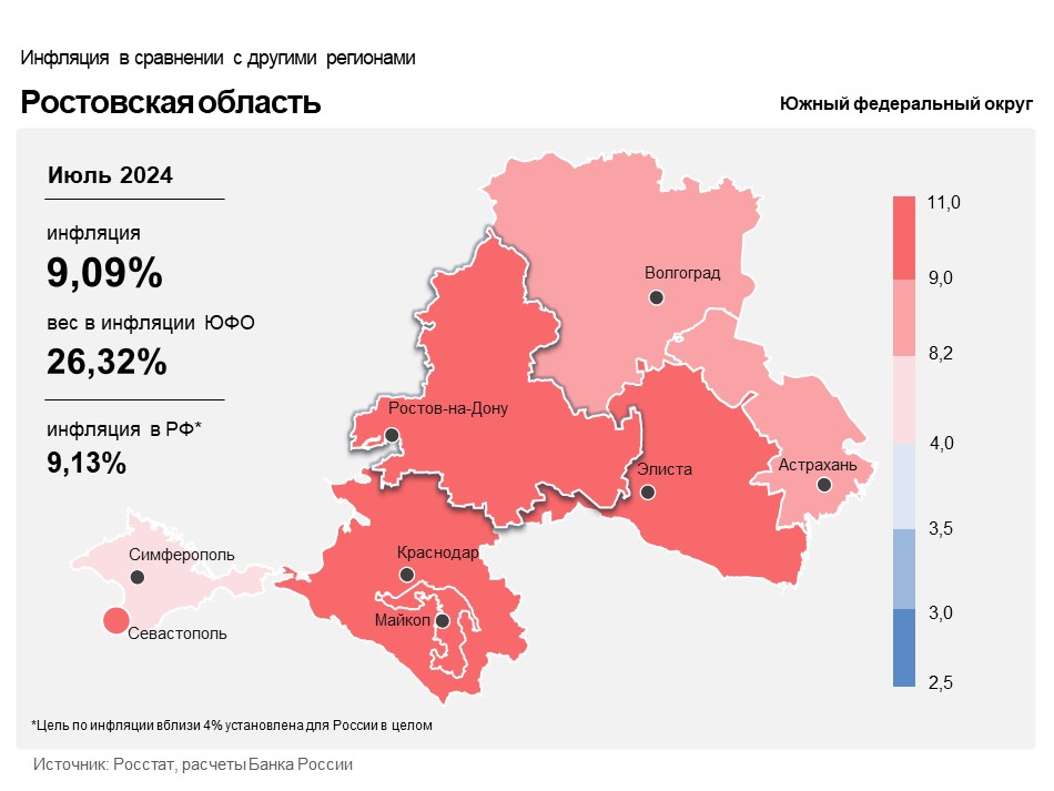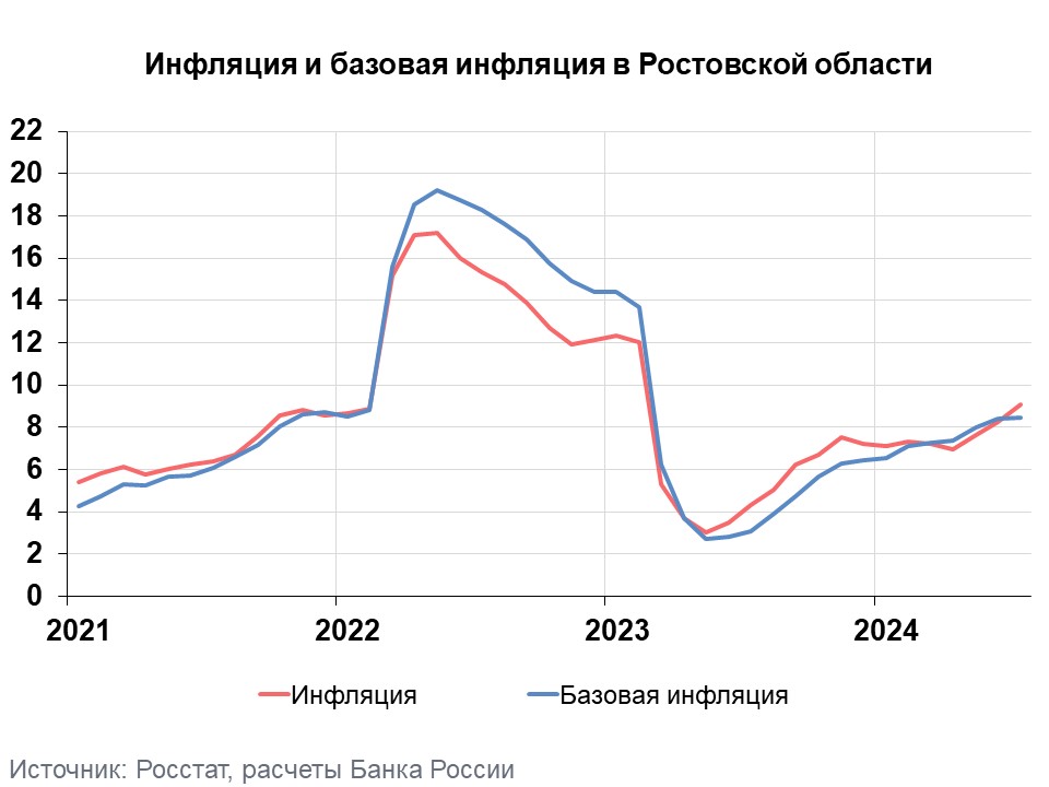 Годовая инфляция на Дону в июле 2024 года увеличилась до 9,09% после 8,23% месяцем ранее. Это ниже, чем в целом по стране (9,13%), но выше показателя в Южном федеральном округе (8,92%). Ускорение инфляции в регионе вызвано сокращением предложения некоторых продуктов питания, а также ростом затрат производителей и поставщиков продовольственных товаров и услуг. Кроме того, в июле 2024 года, в отличие от прошлого года, была проведена индексация тарифов на жилищно‑коммунальные услуги.