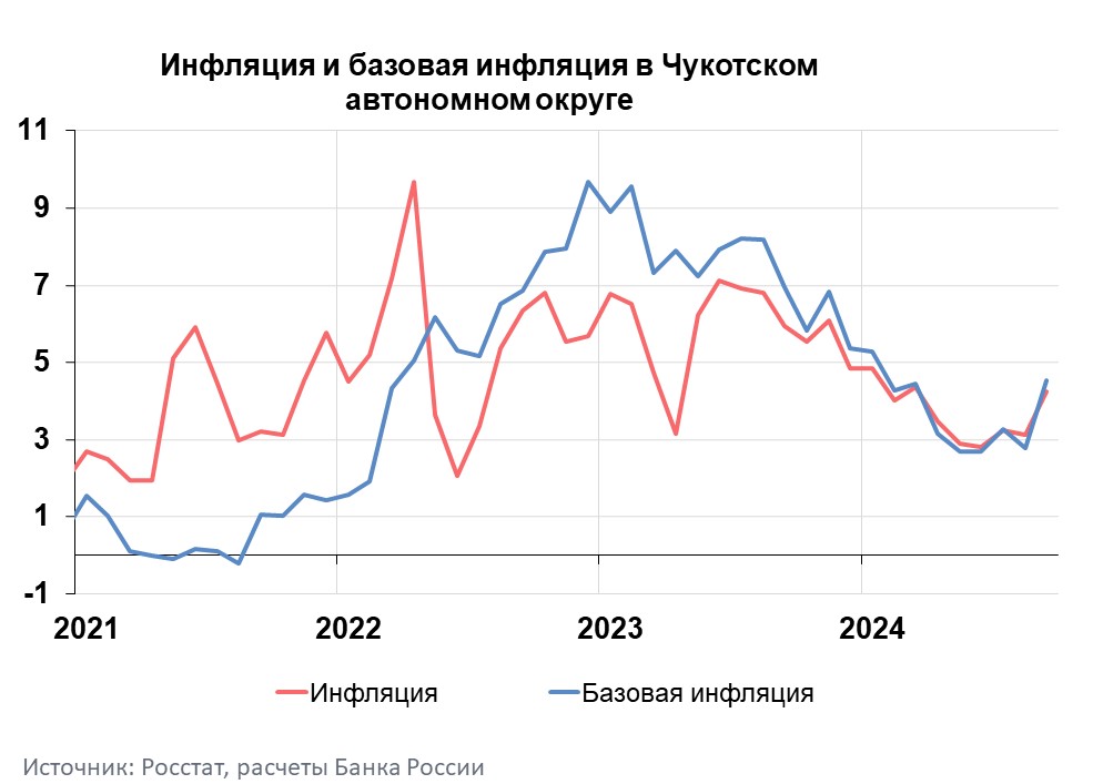 Годовая инфляция на Чукотке в сентябре 2024 года ускорилась и составила 4,25% после 3,12% в августе. Она осталась ниже значений по Дальневосточному федеральному округу (8,55%) и по стране в целом (8,63%). Ускорению годовой инфляции в регионе способствовали рост спроса на некоторые виды услуг, а также изменение правил формирования конечных цен на крупной интернет-площадке для покупателей в некоторых регионах страны.