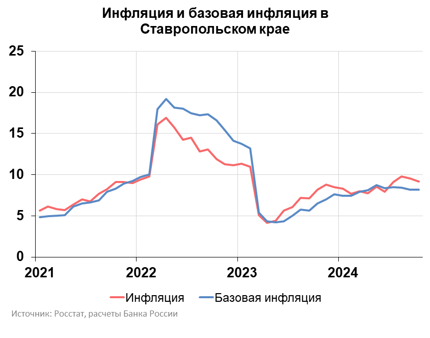 В Ставропольском крае в октябре годовая инфляция замедлилась и составила 9,16% после 9,52% в сентябре. Во многом это объясняется расширением предложения отдельных продовольственных и непродовольственных товаров. Также в динамике цен на некоторые товары и услуги проявился эффект высокой сравнительной базы прошлого года. Инфляция в регионе сложилась почти на уровне показателя по СКФО (9,14%), но превышала значение по России в целом (8,54%).