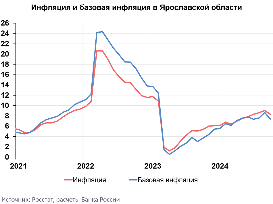 Базовая инфляция в Ярославской области уменьшилась до 7,40% в октябре 2024 года после 8,66 % в сентябре, что ниже уровня региональной инфляции (8,31%).
