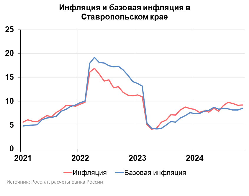В Ставропольском крае в ноябре годовая инфляция ускорилась и составила 9,24% после 9,16% в октябре. В основном это объясняется ростом издержек производителей и поставщиков некоторых продуктов питания. Инфляция в регионе сложилась ниже уровня по СКФО (9,48%), и выше чем по России в целом (8,88%).