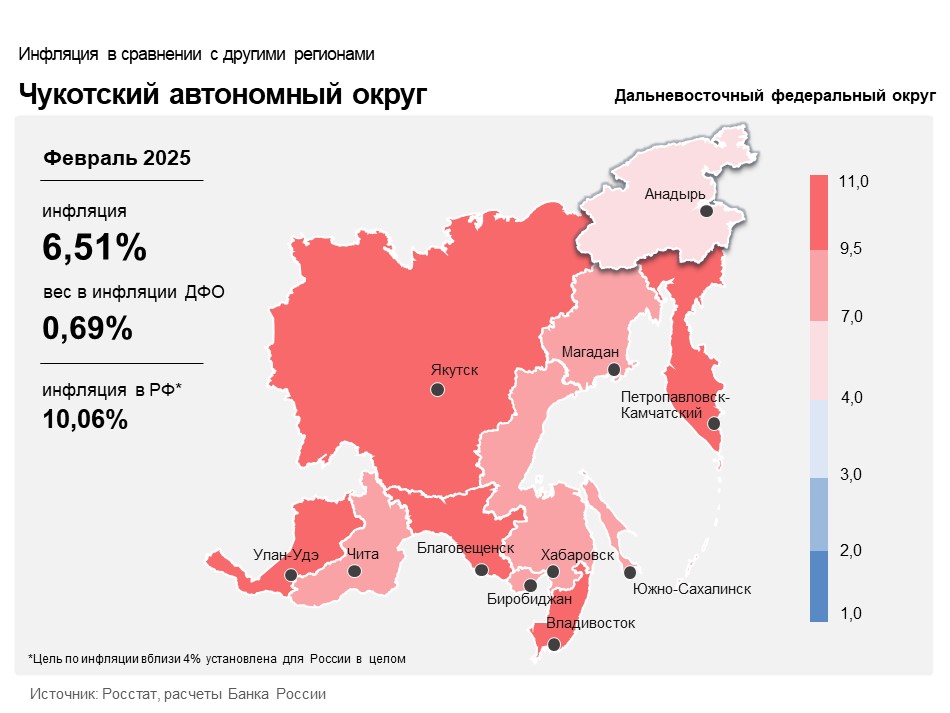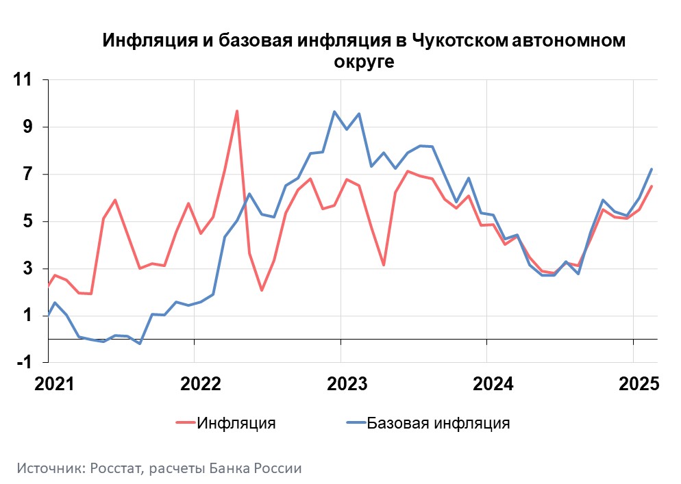 Годовая инфляция на Чукотке в феврале 2025 года ускорилась и составила 6,51% после 5,46% в январе 2025 года. При этом она осталась ниже значений по Дальневосточному федеральному округу (9,57%) и по стране в целом (10,06%). Ускорение годовой инфляции в регионе было вызвано ростом издержек производителей и поставщиков некоторых товаров и услуг.