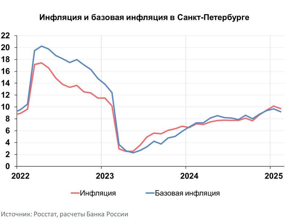 По данным Росстата, годовая инфляция в Санкт-Петербурге в феврале 2025 года замедлилась и составила 9,71% после 10,16% в январе. Инфляция в городе была ниже, чем в Северо-Западном федеральном округе (9,82%) и по стране в целом (10,06%). Основные причины замедления годового роста цен в городе – укрепление рубля, а также некоторое охлаждение спроса на автомобили.