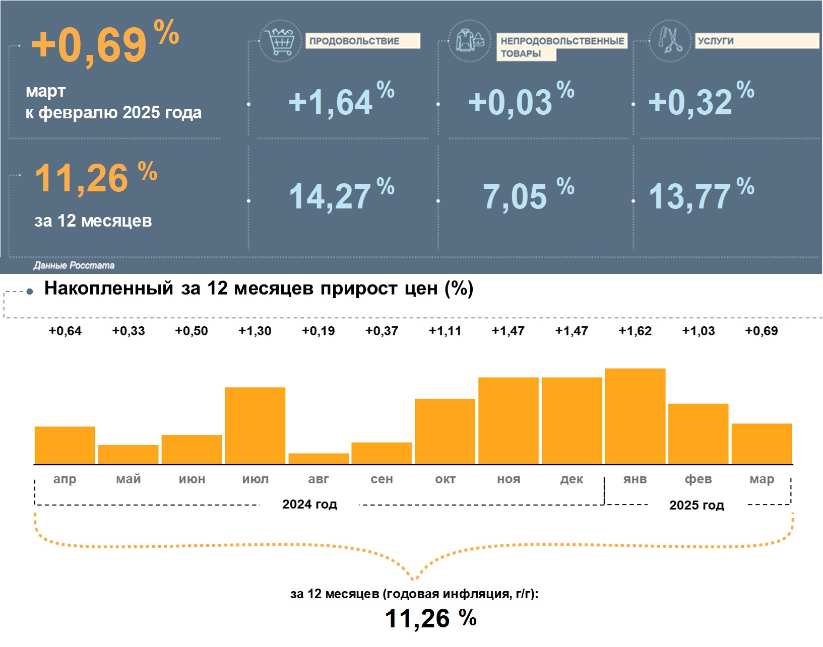 Значительнее всего в марте и в целом за год подорожало продовольствие. Услуги за месяц выросли в цене умеренно, но рост цен за год — выше инфляции. Цены на непродовольственные товары в марте практически не изменились, а за год выросли меньше, чем цены на продукты питания и услуги.