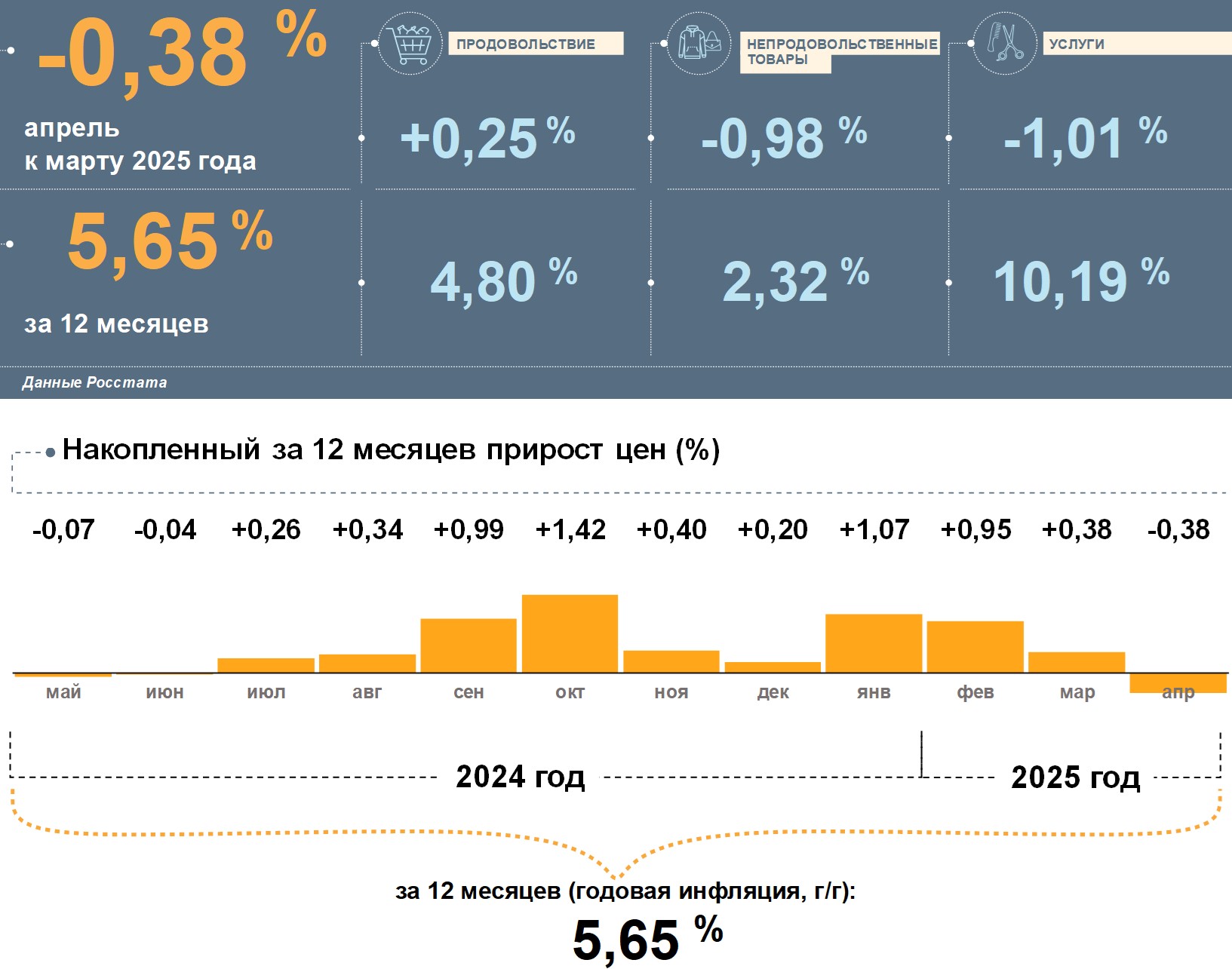 В апреле существенно подешевели непродовольственные товары и услуги. Продукты питания подорожали умеренно. Накопленным итогом за 12 месяцев сильнее всего выросли цены на услуги. Продукты питания и непродовольственные товары прибавили в цене меньше, чем потребительская корзина в целом.