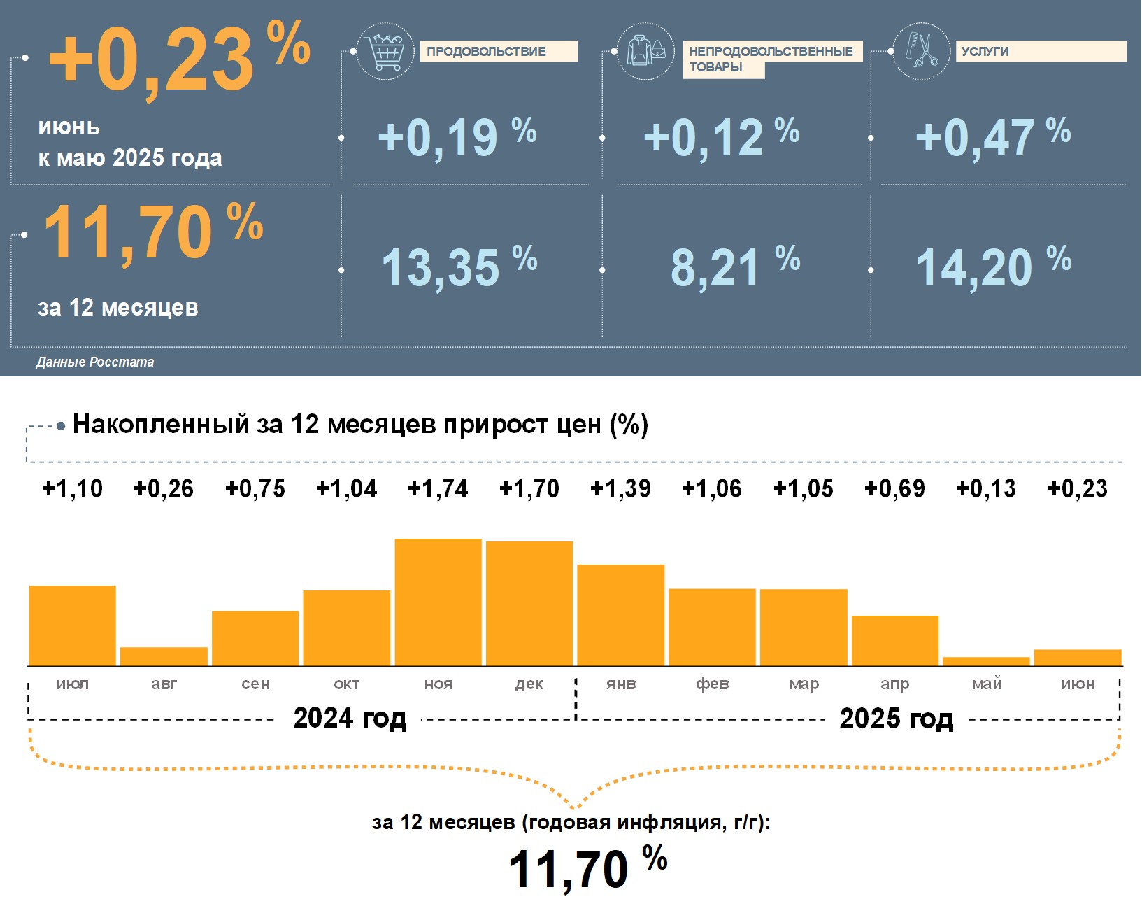 Цены в Вологодской области в июне 2025 года, по данным Росстата, выросли на 0,23% к маю. Годовая инфляция снизилась и составила 11,70%. Это выше, чем в целом по стране (9,40%).