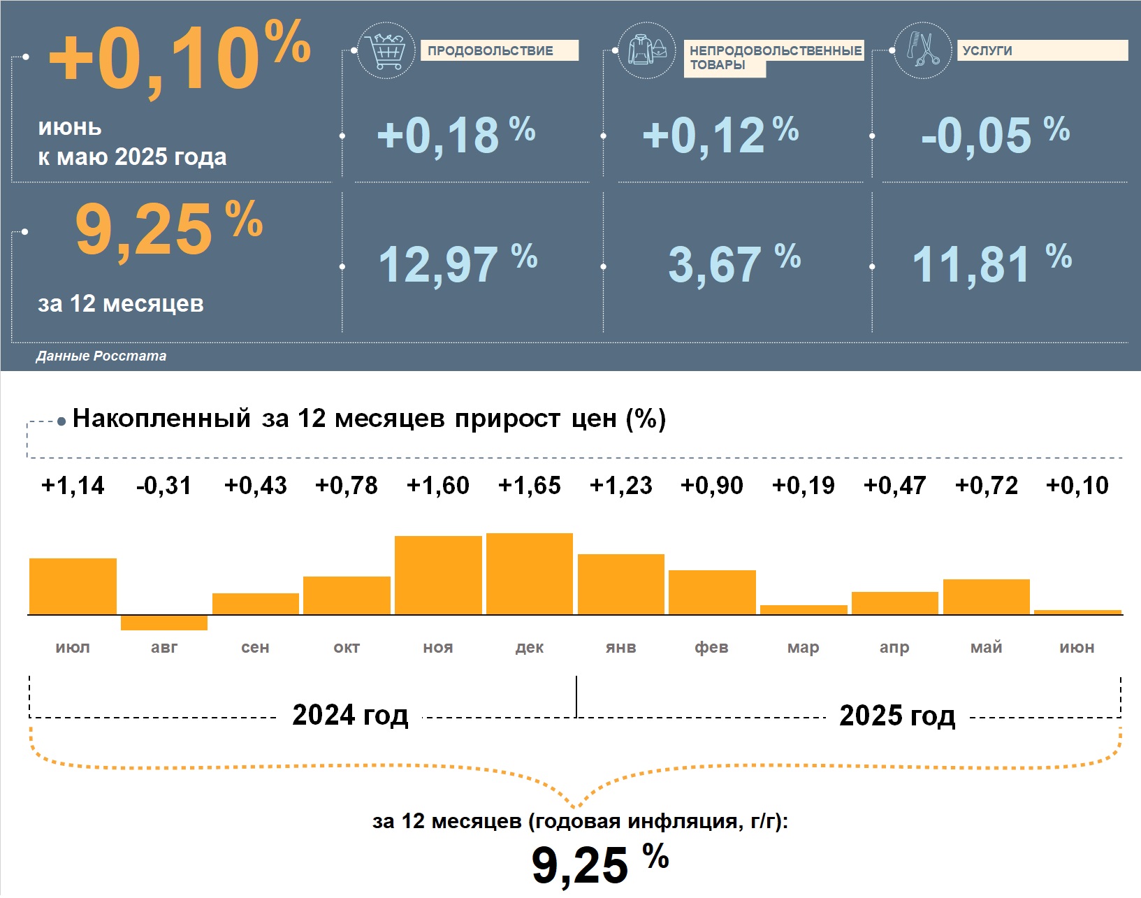 Цены в Тульской области в июне 2025 года, по данным Росстата, выросли на 0,10% к маю. Годовая инфляция снизилась и составила 9,25%. Это ниже, чем в целом по стране (9,40%).