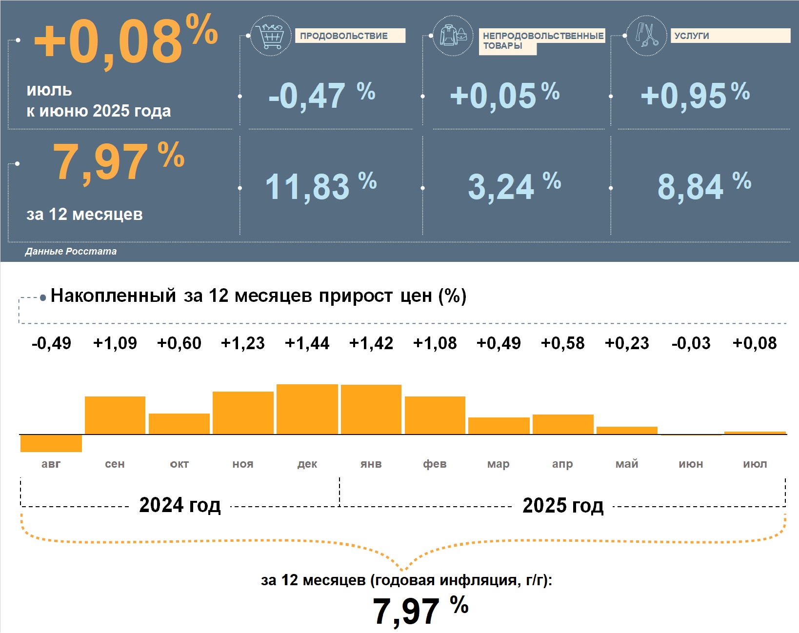 В июле подешевело продовольствие, но за год рост цен на него был выше, чем по всем товарам и услугам. Цены на непродовольственные товары в июле и за 12 месяцев повысились умеренно. Цены на услуги за месяц и в целом за год заметно выросли.