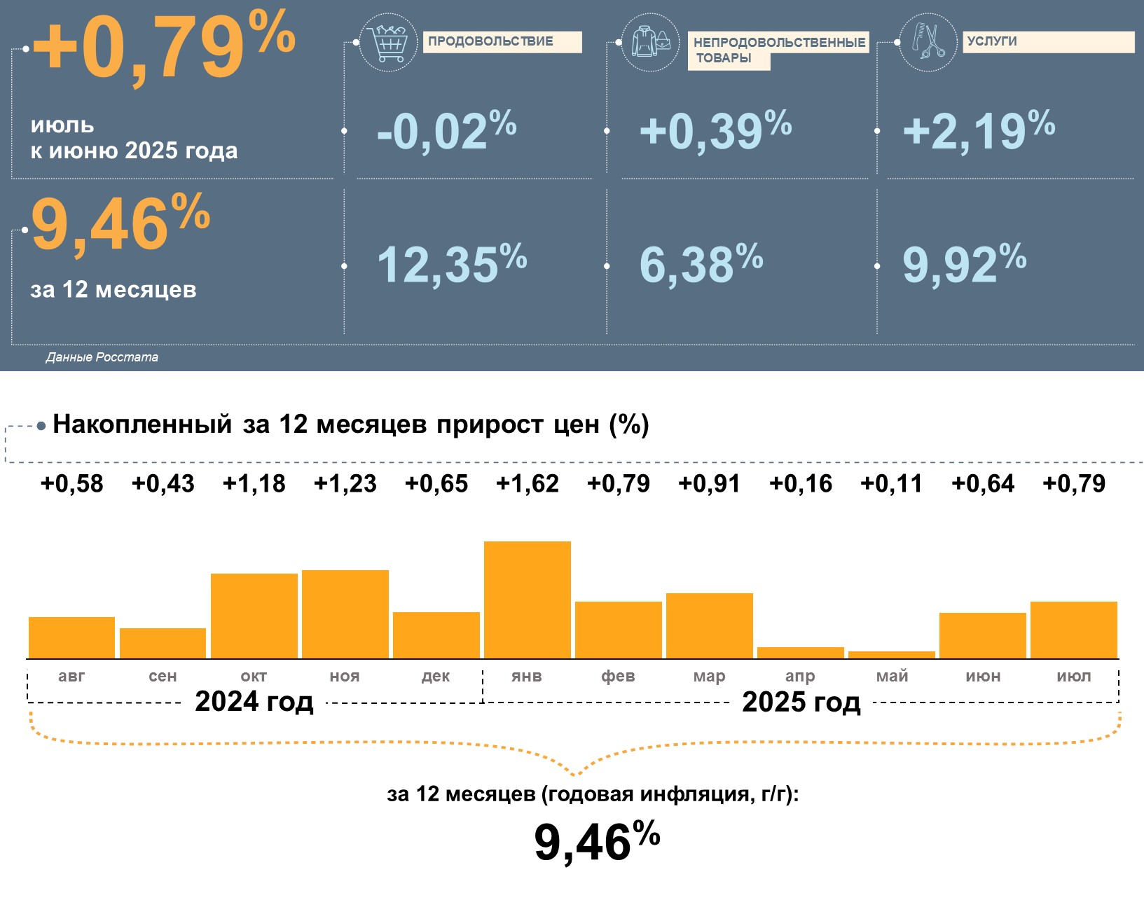 Цены в Амурской области в июле 2025 года, по данным Росстата, выросли на 0,79% по отношению к июню. Годовая инфляция замедлилась и составила 9,46%. Это выше, чем в целом по стране (8,79%).