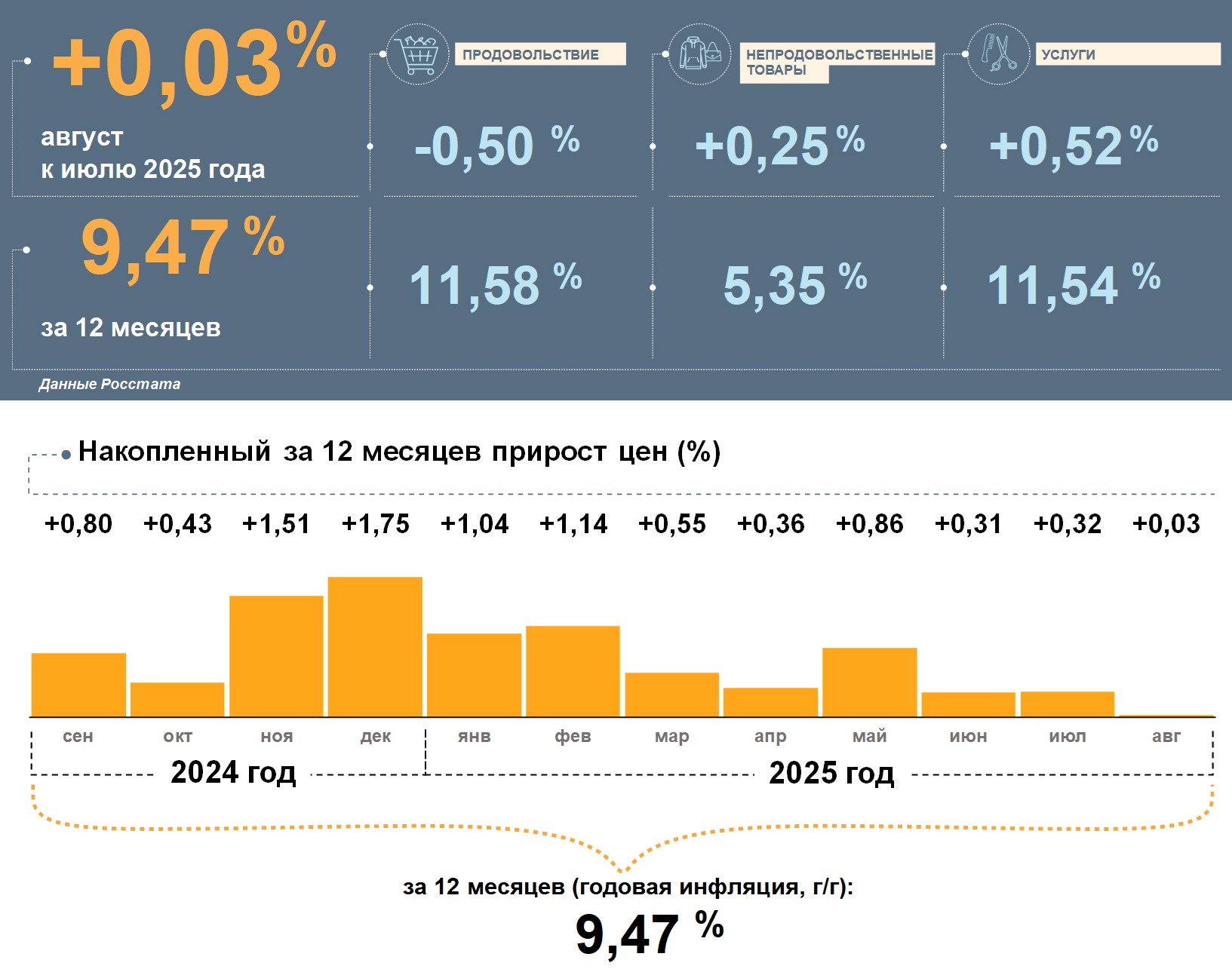Продукты в августе подешевели, но в целом за год цены на них повысились больше, чем на все товары и услуги. Сильнее всего подорожали услуги. Годовой рост цен на них был выше инфляции. Цены на непродовольственные товары за месяц и за год выросли умеренно.