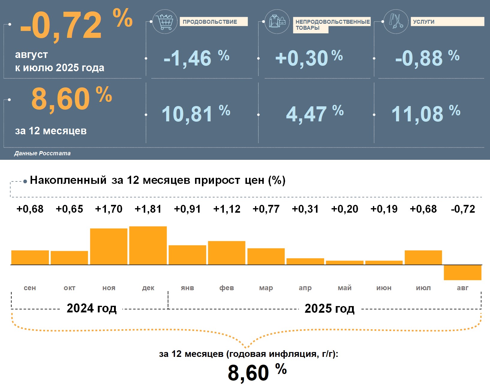 Цены в Оренбургской области в августе 2025 года, по данным Росстата, снизились на 0,72% к июлю. Годовая инфляция замедлилась и составила 8,60%. Это выше, чем в целом по стране (8,14%).