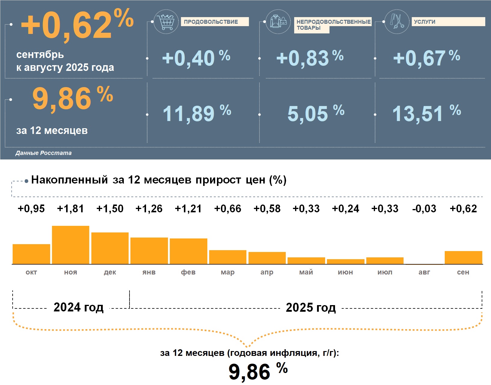 Цены в Кировской области в сентябре 2025 года, по данным Росстата, выросли на 0,62% по сравнению с августом. Годовая инфляция перешла к росту после замедления в течение пяти месяцев подряд и в сентябре составила 9,86%. Это выше, чем в целом по стране (7,98%).