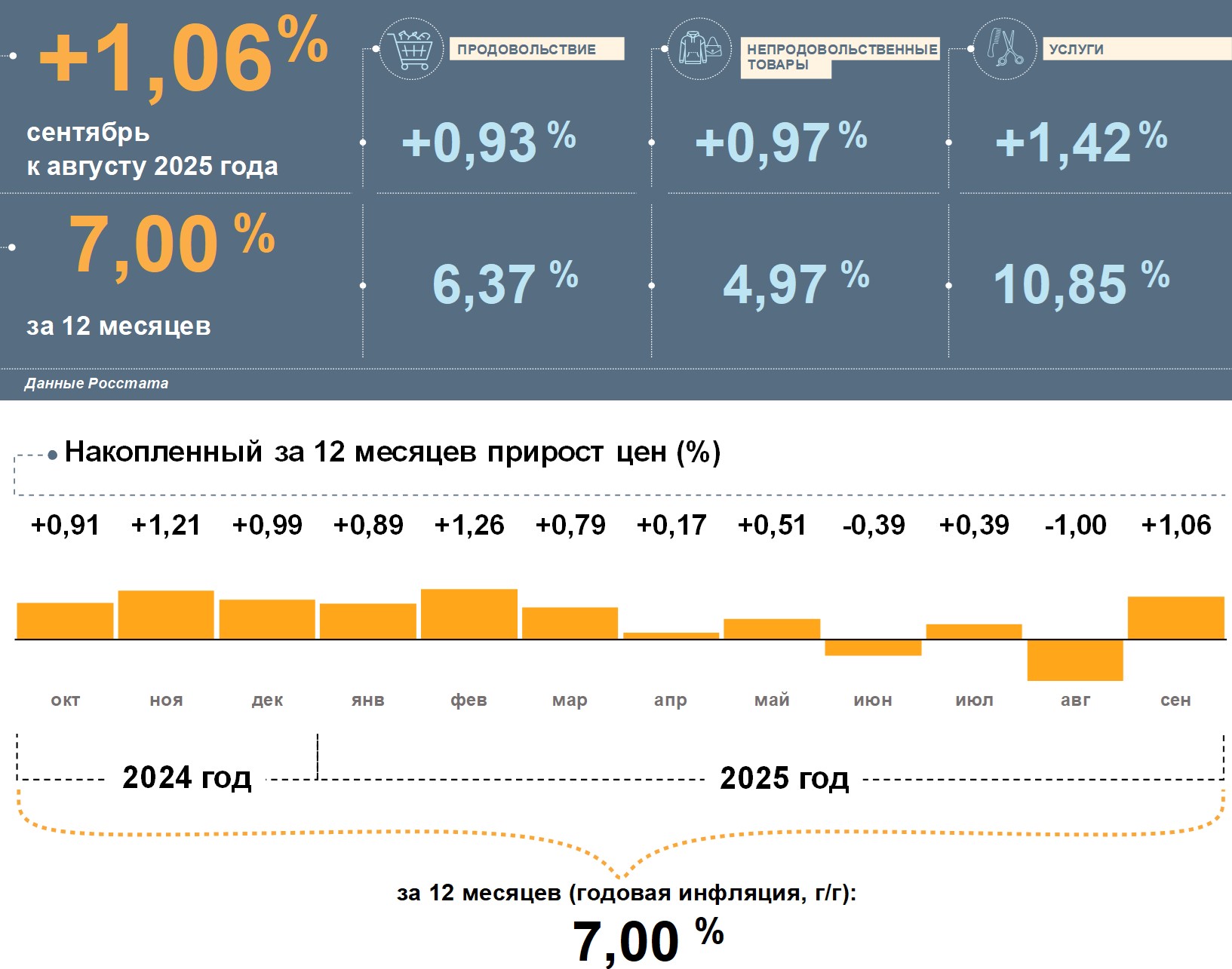 Цены в Республике Северная Осетия-Алания в сентябре 2025 года, по данным Росстата, выросли на 1,06% к августу. Годовая инфляция ускорилась и составила 7,00%. Это ниже, чем в целом по стране (7,98%).