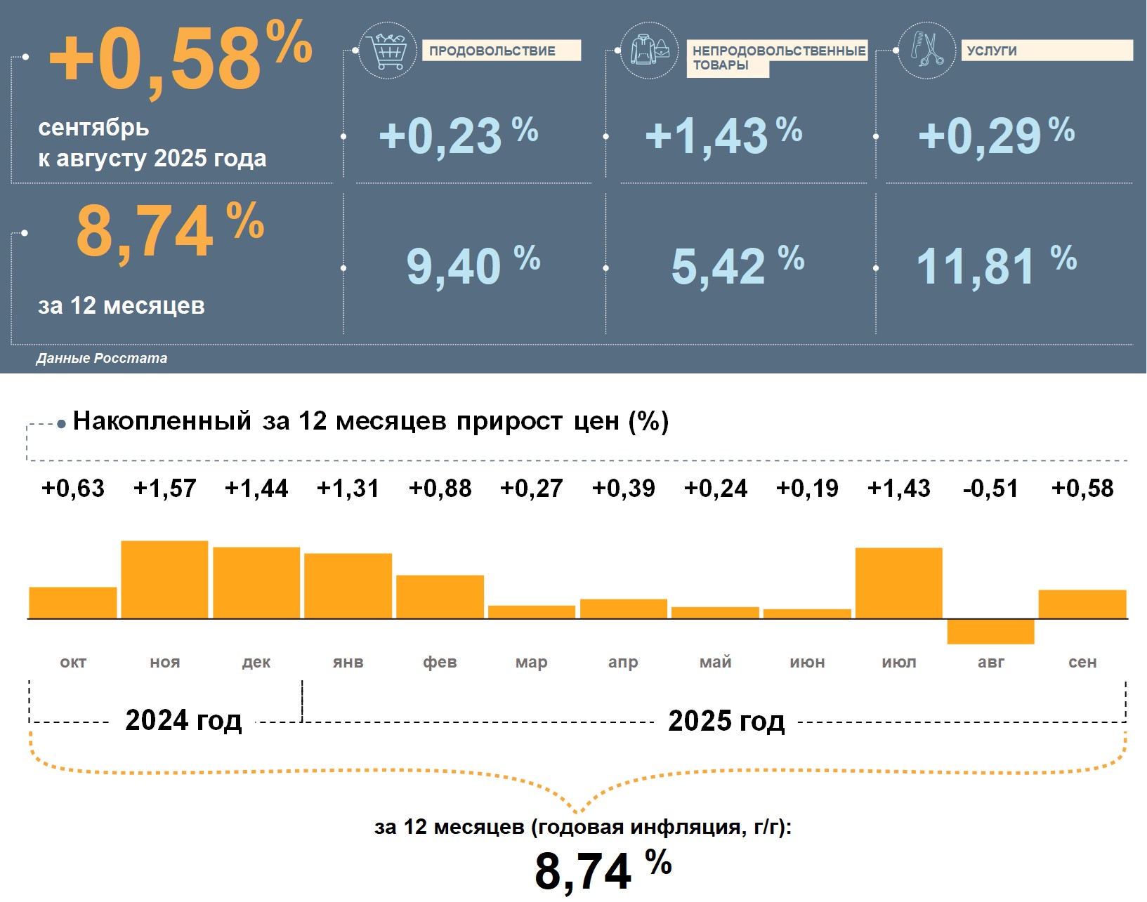 Наиболее заметно за месяц подорожали непродовольственные товары, но в целом за год прирост цен на них был ниже инфляции. Цены на продовольствие и услуги в сентябре выросли умеренно. При этом в годовом сравнении рост цен на них был больше, чем на всю потребительскую корзину.