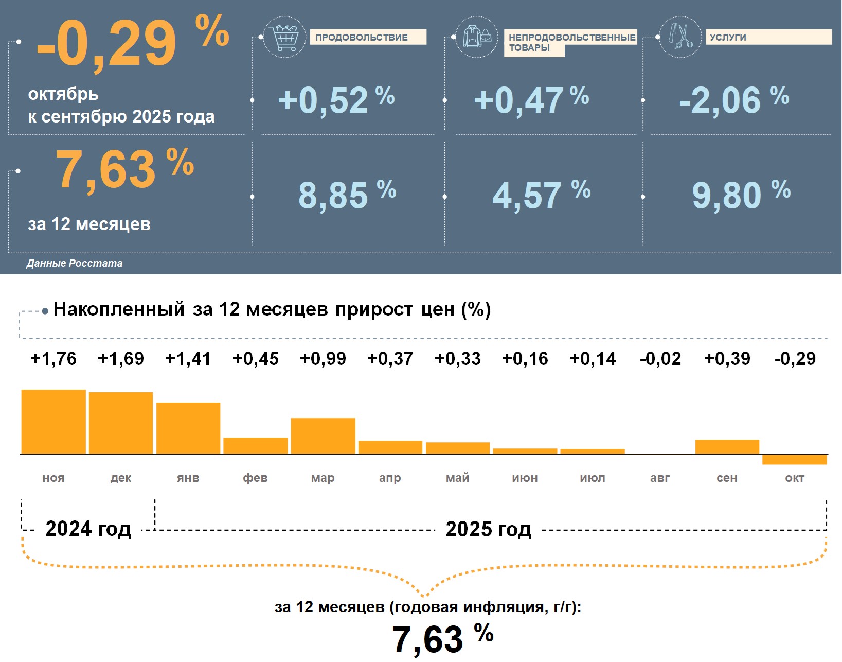 Цены в Санкт-Петербурге в октябре 2025 года, по данным Росстата, снизились на 0,29% к сентябрю. Годовая инфляция замедлилась и составила 7,63%. Это ниже, чем в целом по стране (7,71%).