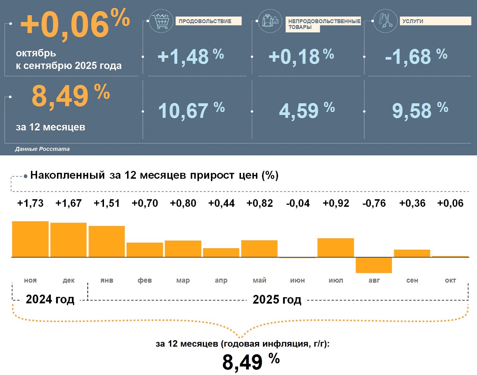 Цены в Ярославской области в октябре 2025 года, по данным Росстата, выросли на 0,06% к сентябрю. Годовая инфляция также увеличилась и составила 8,49%. Это выше, чем в целом по стране (7,71%).