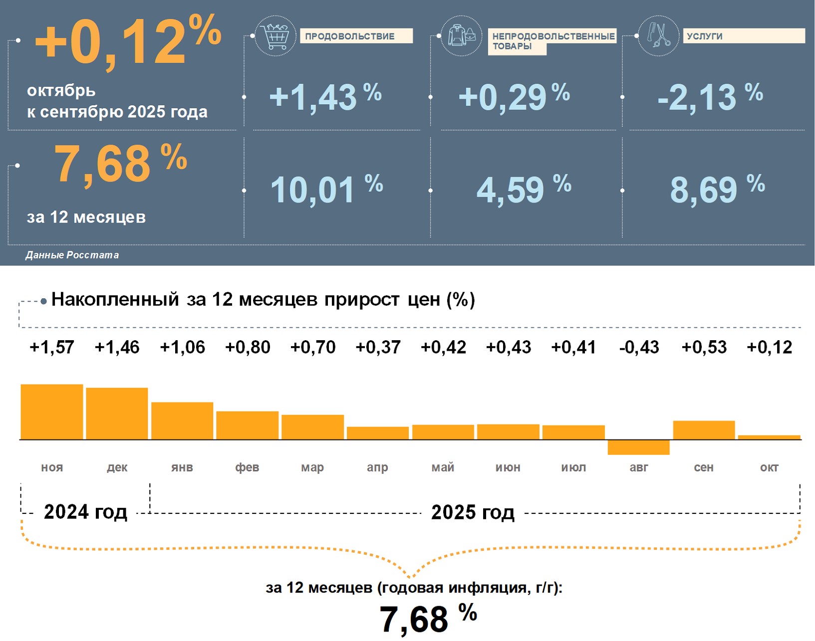 Цены в Калужской области в октябре 2025 года, по данным Росстата, выросли на 0,12% к сентябрю. Годовая инфляция также выросла и составила 7,68%, что почти соответствует уровню в целом по стране (7,71%).