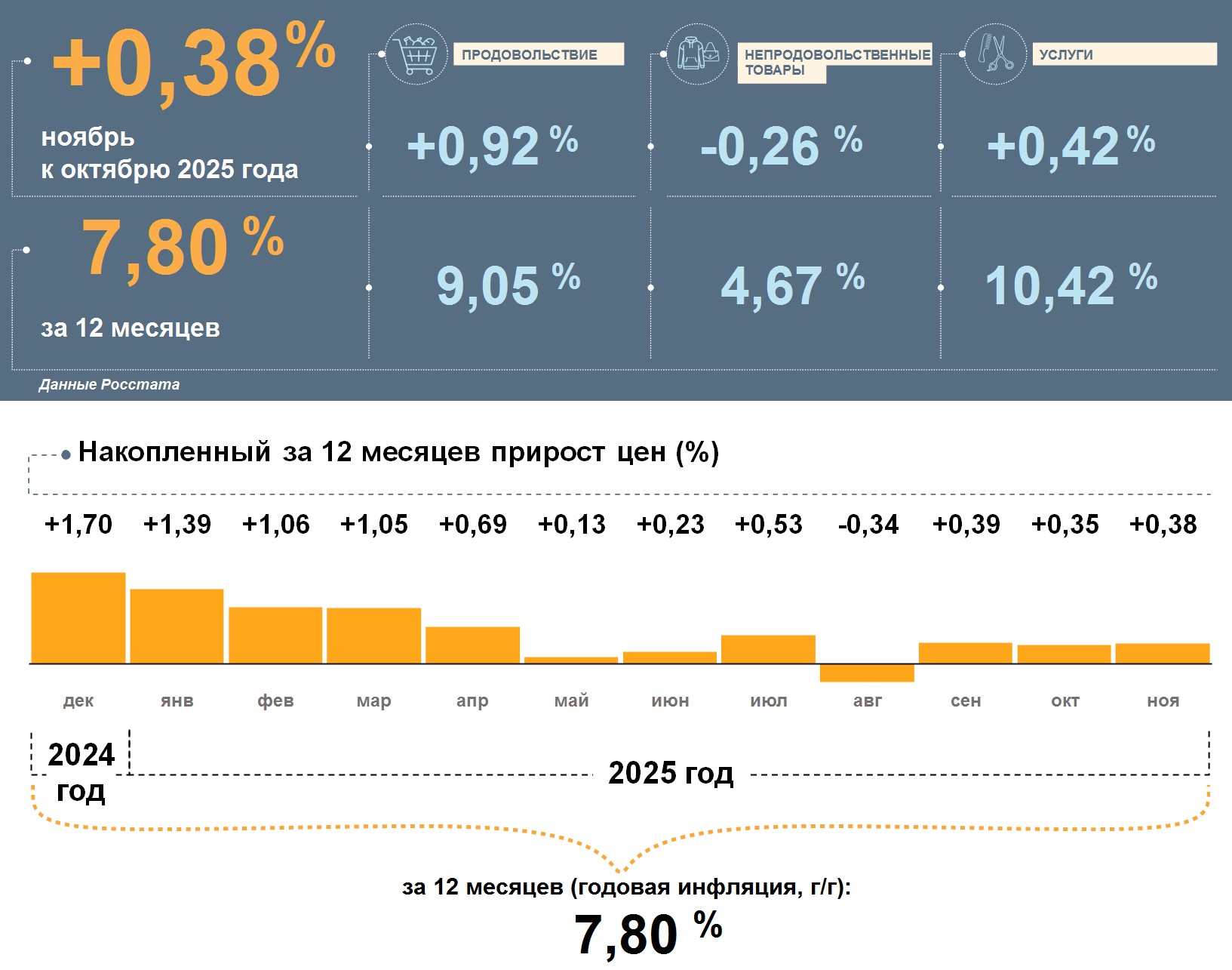 Цены в Вологодской области в ноябре 2025 года, по данным Росстата, выросли на 0,38% по сравнению с октябрем. Годовая инфляция снижается седьмой месяц подряд – в ноябре она составила 7,80%. Это выше, чем в целом по стране (6,64%).