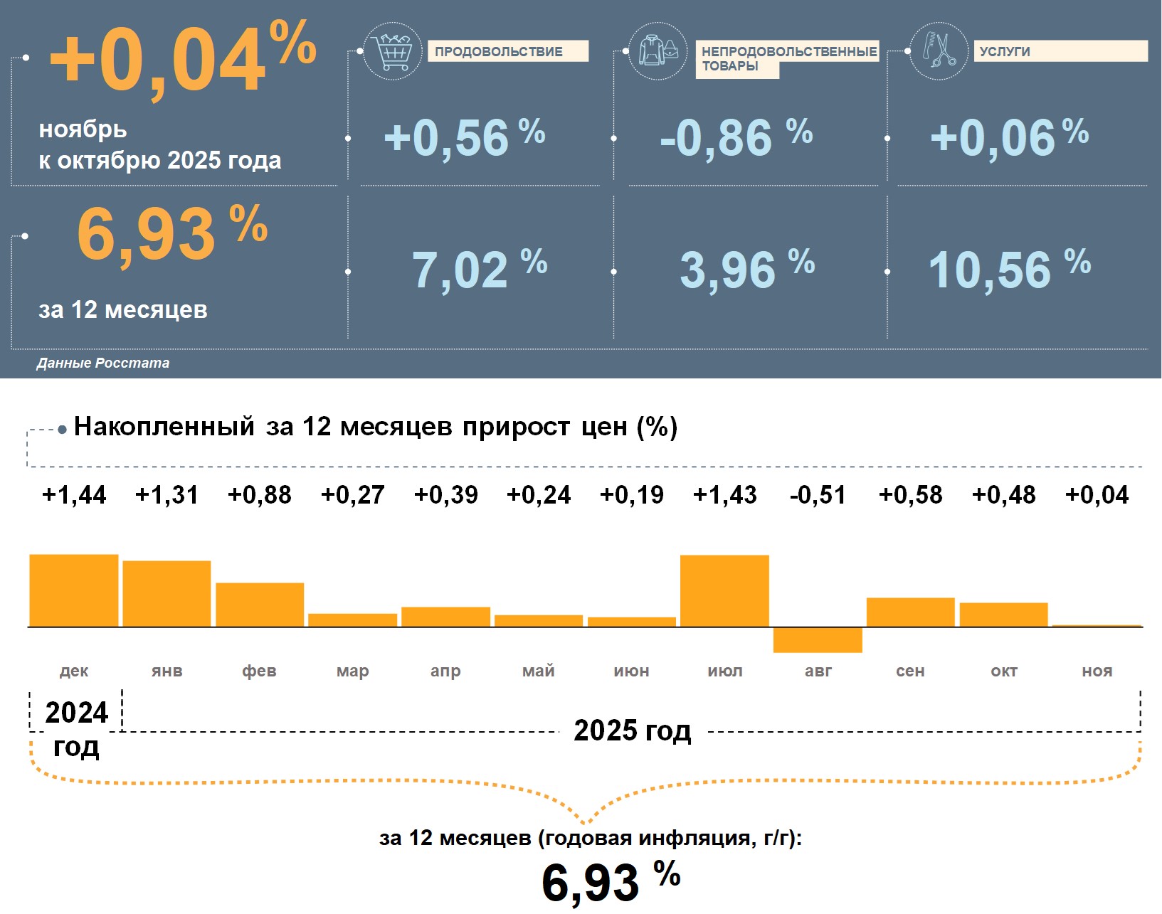 По данным Росстата, цены в Республике Мордовия в ноябре 2025 года выросли на 0,04%. Годовая инфляция снизилась и составила 6,93%. Это выше, чем в целом по стране (6,64%).