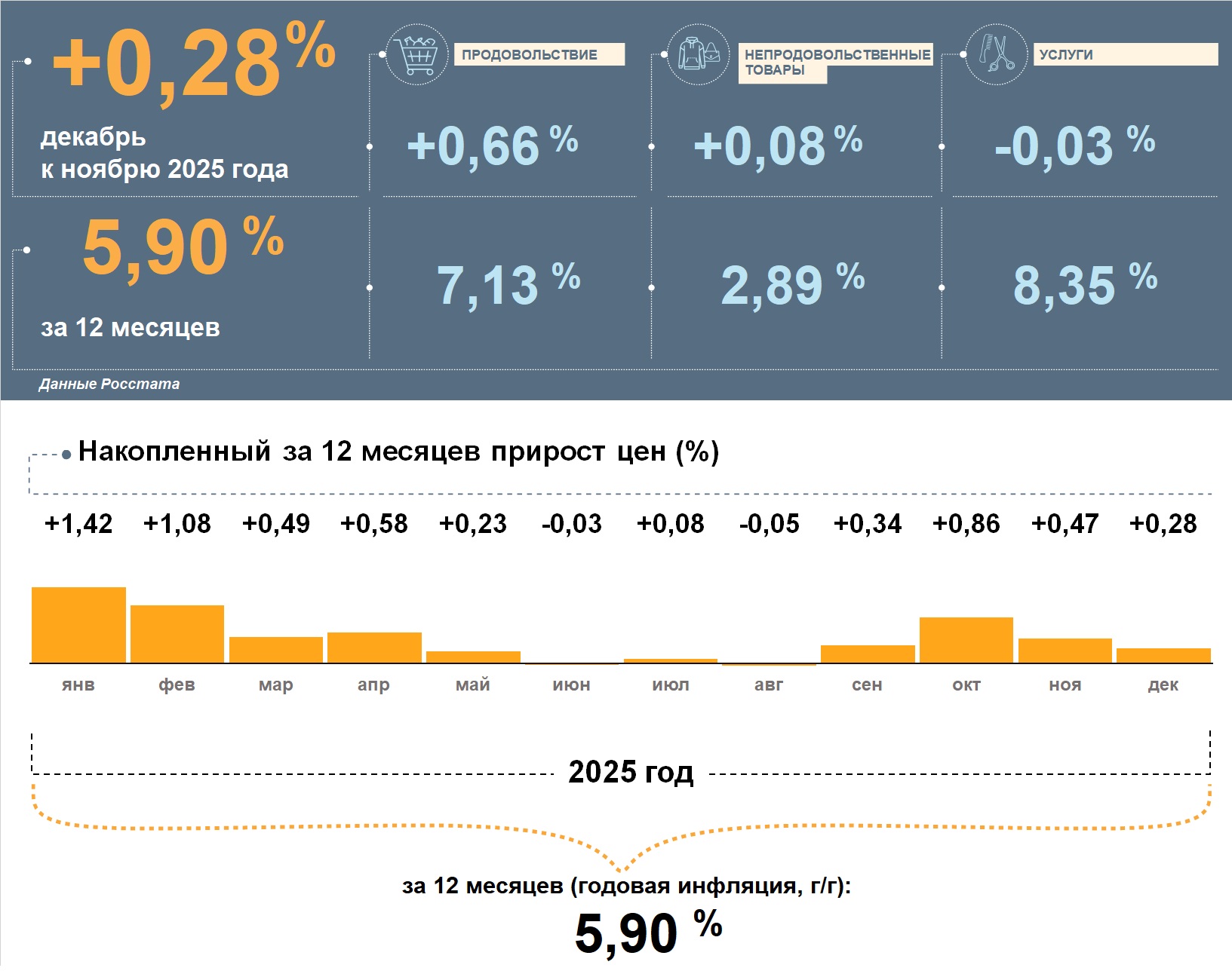 Цены в Иркутской области в декабре 2025 года, по данным Росстата, выросли на 0,28% по сравнению с ноябрем. Годовая инфляция продолжила замедляться и составила 5,90%. Это выше, чем в целом по стране (5,59%).