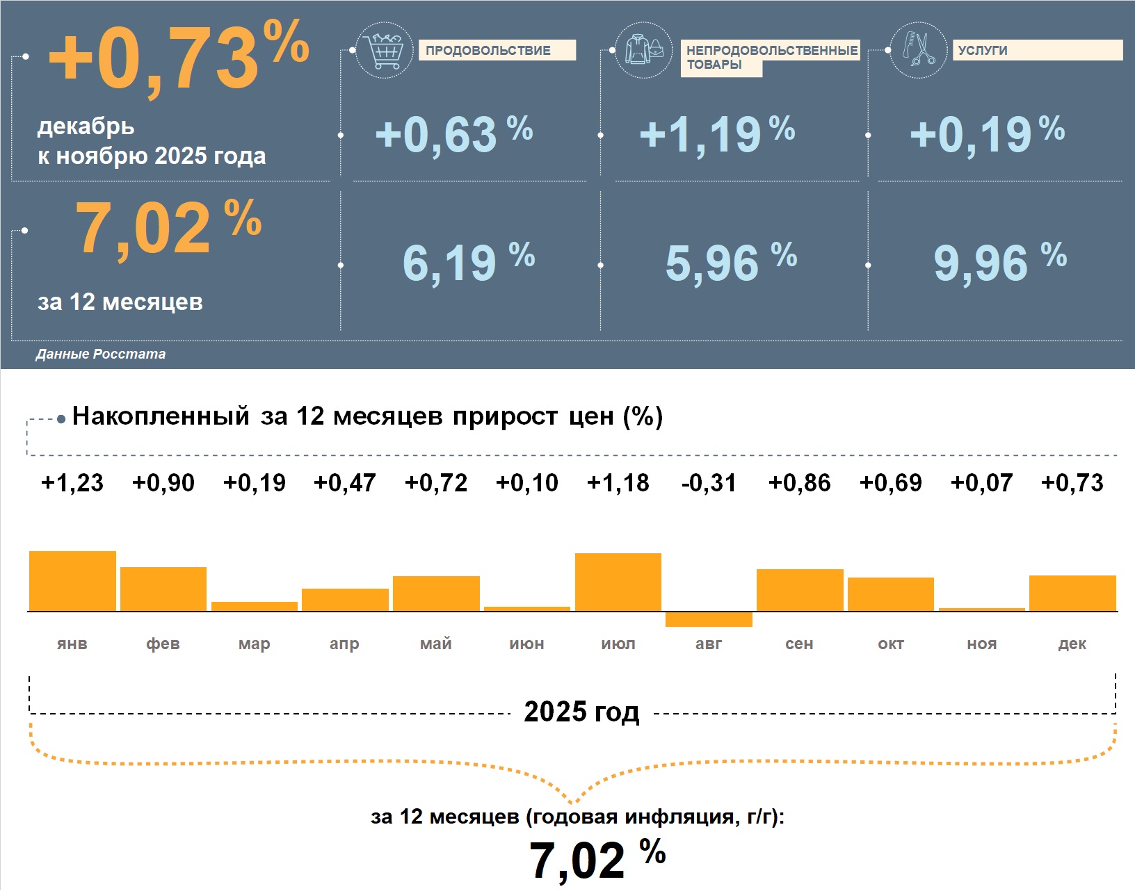 Цены в Тульской области в декабре 2025 года, по данным Росстата, выросли на 0,73% к ноябрю. Годовая инфляция снизилась и составила 7,02%. Это выше, чем в целом по стране (5,59%).