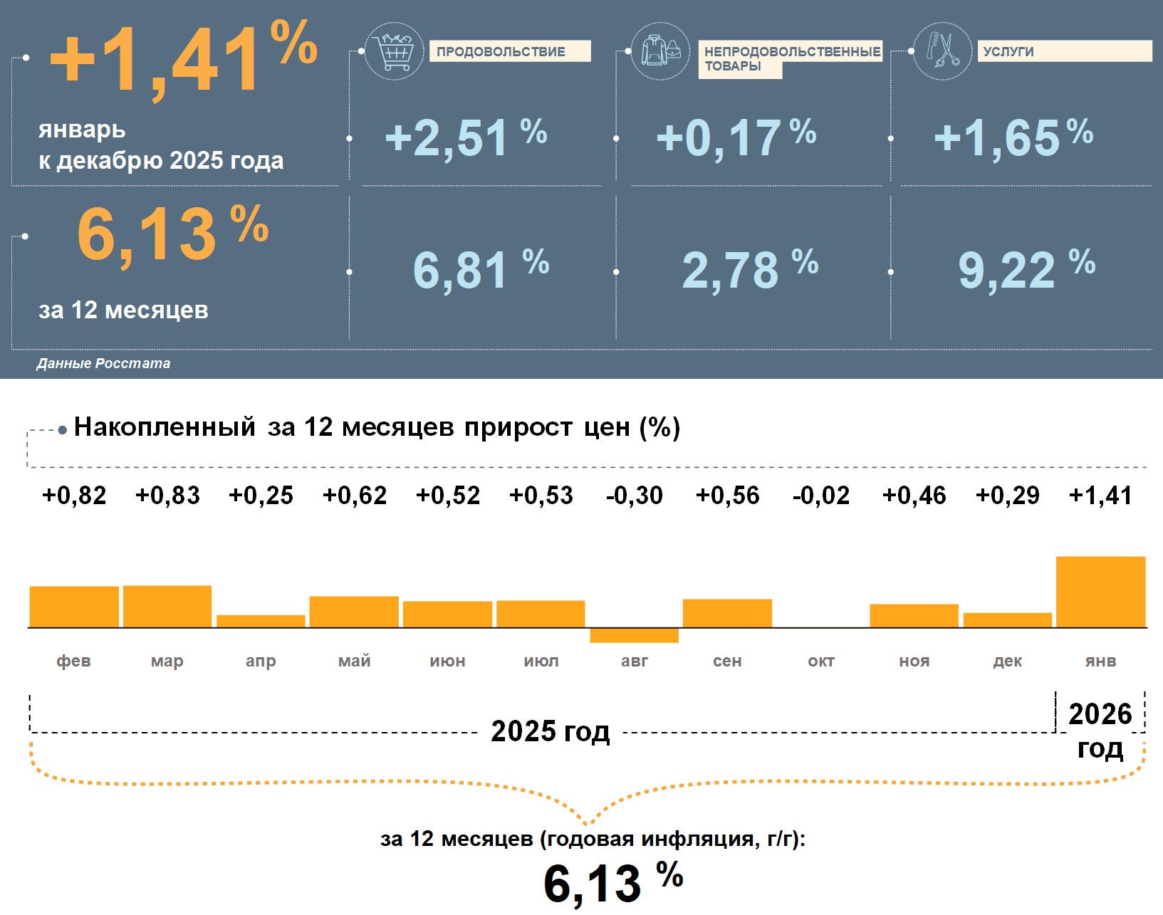 Цены в Республике Карелия в январе 2026 года, по данным Росстата, выросли на 1,41% к декабрю 2025 года. Годовая инфляция замедлилась до 6,13%. Это выше, чем в целом по стране (6,00%).