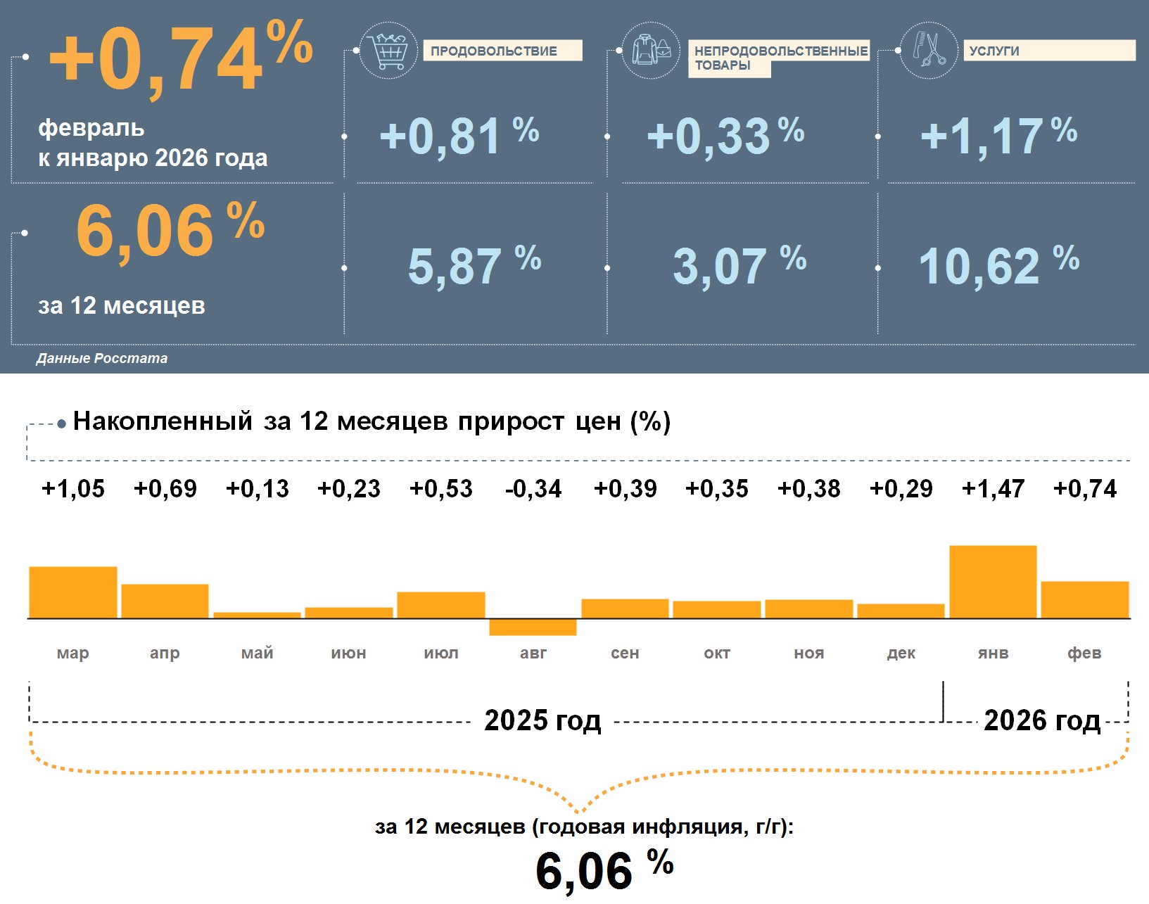 Цены в Вологодской области в феврале 2026 года, по данным Росстата, выросли на 0,74% по сравнению с январем. Годовая инфляция замедлилась и составила 6,06%. Это выше, чем в целом по стране (5,91%).